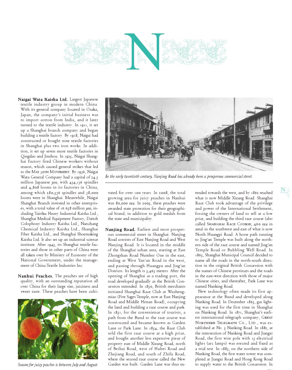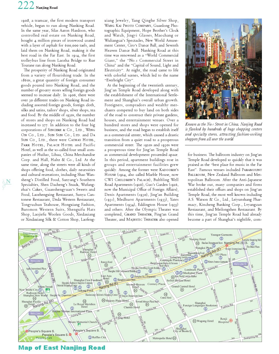 Nanjing Road is the earliest and mostprosperous commercial street in Shanghai. It consists of East Nanjing Road andWest Nanjing Road. Nanjing Road is located in the centre of the Shanghai urbanarea, extending from East Zhongshan Road in the east to West Yan'an Road in thewest, and passing through Huangpu and Jing'an Districts with a length of 5,465meters. After the opening of Shanghai as a tradingport, the road developed gradually as the British Concession expanded. In 1850,British merchants established Shanghai Race Club at the intersection of EastNanjing Road and Middle Henan Road. In 1851, for the convenience of tourists, apath from the Bund to the race course was constructed and became known asGarden Lane or Park Lane. In 1854, the Race Club sold the first race course ata high price, and bought another less expensive piece of property east ofMiddle Xizang Road, north of Beihai Road, west of Hubei Road and Zhejiang Road,and south of Fuzhou Road, where the second race course called the New Gardenwas built. Garden Lane was thus extended towards thewest, and by 1862 reached what is now Middle Xizang Road. Shanghai Race Clubtook advantage of the privilege and power of the international settlement,forcing the owners of land to sell at a low price, and building the third racecourse (also called Shanghai Race Course, 460 MU in area) in the southwest andeast of what is now North Huangpi Road. A horse path running to Jing'an Templewas built along the northern side of the race course and named Jing’an TempleRoad or Bubbling Well Road. In 1865, Shanghai Municipal Council decided to nameall the roads in the north-south direction in the original British Concessionwith the names of Chinese provinces and the roads in the east-west directionwith those of major Chinese cities, and thereafter, Park Lane was named NanjingRoad. New technology often made its firstappearance at the Bund and developed along Nanjing Road. In December 1865, gaslighting was used for the first time in Shanghai on Nanjing Road. In 1871,Shanghai's earliest international telegraph company, Great Northern TelegraphCo; Ltd. was established at No.5 Nanjing Road. In 1882, at the intersection ofNanjing Road and Jiangxi Road, the first wire pole with 15 electrical lightswas erected and fixed as a trial test. In 1883, on the northern side of NanjingRoad, the first water tower was completed at Jiangxi Road and Hong Kong Road tosupply tap water to the British Concession. In 1908, a tramcar, the first moderntransport vehicle, began to run along Nanjing Road. In the same year, SilasAaron Hardoon, who controlled real estate on Nanjing Road, bought 4 millionpieces of ironwood coated with a layer of asphalt and laid them on NanjingRoad, making it the best road in the Far East. In 1914, the first trolleybusline ran along Nanjing Road. The prosperity of Nanjing Road originatedfrom a variety of flourishing trade. In the I860s, a great quantity of foreignconsumer goods poured into Nanjing Road, and the number of grocery storesselling foreign goods seemed to increase daily. In 1906, there were over 30 differenttrades on Nanjing Road including assorted foreign goods, foreign cloth, silksand satins, tailors' shops, silver shops, tea and food. By the middle of 1930s,the number of stores and shops on Nanjing Road had increased to 277. Inaddition, there were famous hotels like Cathay Hotel, Park Hotel, Palace Hoteland Pacific Hotel. At the same time, along the streets wereall kinds of shops offering food, clothes, daily necessities and culturalrecreations, including Shao Wansheng's Distilled Food, Sanyang's Specialties,Shen Dacheng's Snack, Wu Fangzhai's Rice Dumpling, Guan Shengyuan's Sweets andFood, Laojiefu’s Woolen Goods, Xindaxiang Silk Shop, Laofeng-xiang Jewelry,Wang Kai Photo Company, Guanlong Photographic Equipment, Ho, Brother's Clockand Watch, Jingyi Glasses, Maochang Spectacles, New World Amusement Center,Ciro's Dance Ball, and Seventh Heaven Dance Hall. Nanjing Road at that time was renowned as a"World Commercial Giant," the "No.1 Commercial Street inChina" and the "Capital of Sound, Light and Electricity". Atnight, the road came to life with colorful scenes, which led to the nickname,the "Everbright City". At the beginning of the twentieth century,Jing'an Temple Road developed along with the establishment of the InternationalSettlement and Shanghai's overall urban growth. Foreigners and wealthymerchants competed to buy land on both sides of the road to construct theirprivate gardens, houses, and entertainment venues. Over a hundred stores andshops were opened for business, and the road began to establish itself as acommercial center, which caused a drastic transition from a quiet road to aprosperous commercial street. The 1920s and 1930s were a prosperous timefor Jing’an Temple Road as commercial development proceeded rapidly. In thisperiod, apartment buildings rose in groups and entertainment facilities grewquickly. Among the former were Kadoorie House(1924, also called Marble House,now CWI Children’s Palace), Bubbling Well Road Apartments (1926), Guo's Garden(1926, now the Municipal Office of Foreign Affairs), Denis Apartments (1930),Jing, Building (1931), Medhurst Apartments (1931), Yates Apartments (1934), MdingtonHouse (1939) and others. After the Olympic Theater was completed, GrandTheater, Ping'an Grand Theater, and Majestic Theater also opened for business. The ballroom industry on Jing'an TempleRoad developed so quickly that it was praised as the "best place for musicin the Far Ease". Famous venues included Paramount Ballroom, New ZealandBallroom and Metropolitan Ballroom. After outbreak of the Anti-Japanese War,many companies and firms established their offices and shops on Jing’an TempleRoad, the most well known including A.S. Watson & Co., Ad., LeiyunshangPharmacy, Kincheng Banking Corp., Lvyangcun Restaurant, and MeilongzhenRestaurant. By then, Jing'an Temple Road had already become a part ofShanghai's nightlife, comp